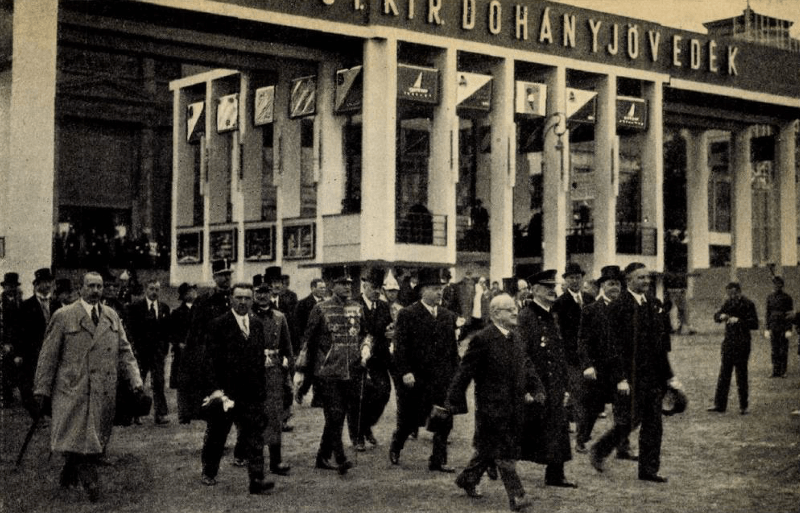 Horthy és kísérete látogatja a Dohánypavilont