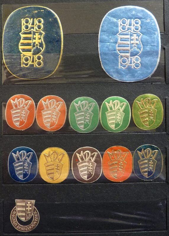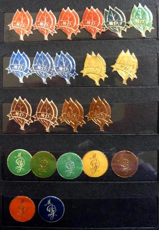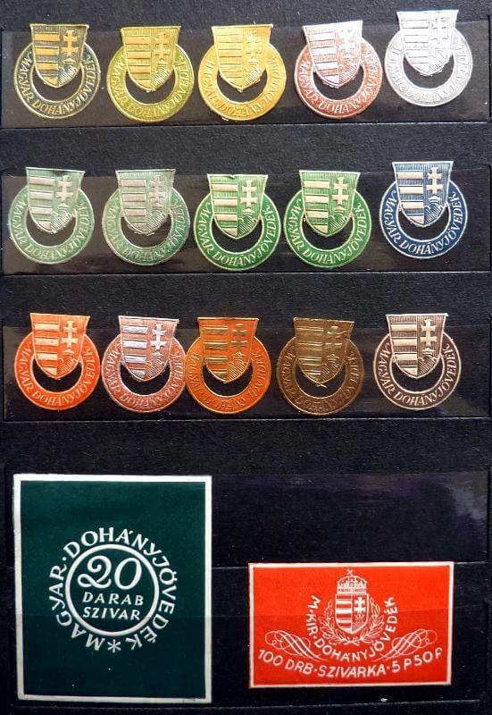 A cigarettás és szivaros dobozok leragasztására szolgáló apró címkék, úgynevezett "pecsétjegyek" - feltehetően Végh Gusztáv /1889-1973/ grafikusművész tervezte őket a II. világháború után újjáalakuló Magyar Dohányjövedék számára.