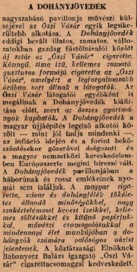 Az őszi Budapesti Nemzetközi Vásár (BNV) Dohánypavilonjának is az új 3 éves Terv volt a fő attrakciója, de emellett Őszi Vásár 1947. néven alkalmi cigarettát is kiadtak. Az eseménnyel kapcsolatban a Demokrácia szeptember 14-i cikke ezt írta: „A Dohányjövedék pavilonjában a háborúnak és rossz emlékeinek nyomát sem találjuk. A magyar cigaretta, szivar és dohányfélék tökéletes állandó minőségükkel, nagy szakértelemmel kevert ízeikkel, kellemes töltésükkel és kitűnő papírjukkal, művészi csomagolásukkal a mindennapi élet munkájában a dohányzók számára valóságos oázist jelentenek. A köztársasági elnöknek Babanyecz Balázs igazgató »Őszi Vásár« cigarettacsomaggal kedveskedett.”