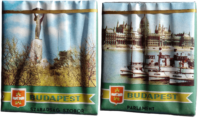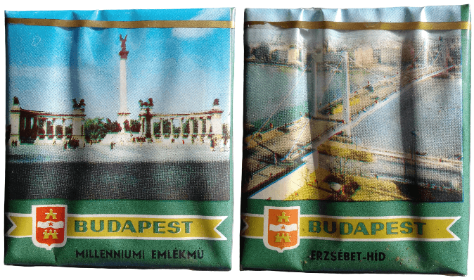 A lágymányosi változattal ellentétben az egri Budapest csomagjainak alján feliratok is szerepeltek a feltüntetett látványosságok neveivel.