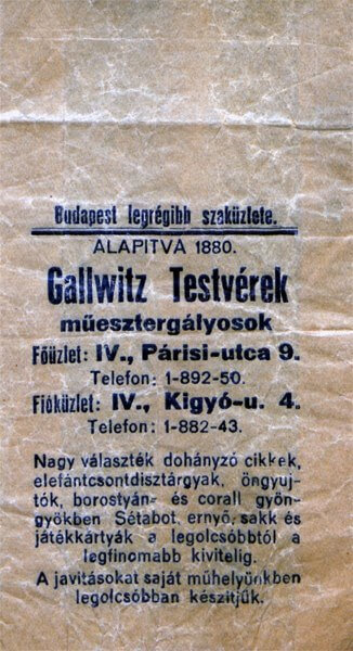 1880-ban Gallwitz Lipót alapította Pest első esztergályos műhelyét a Koronaherceg (ma Petőfi Sándor) utcában. Ő még lábbal hajtható esztergapadon készítette a pipákat és más művészeti tárgyakat. Fiai alapították meg a Gallwitz Testvérek céget a Párisi utca 9. szám alatt. Fióküzletük a Kígyó utca 4-ben, műhelyük a Városház utcában működött.