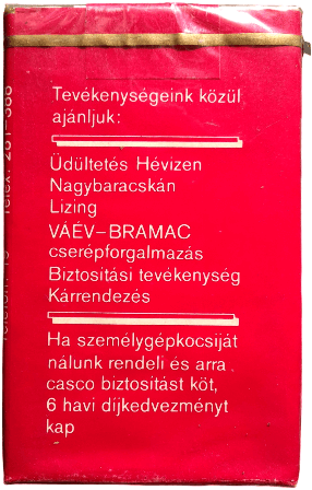 A cigaretta csomagjáról megtudható, hogy az 1958-ban alapított cég pénzügyi, biztosítási és kárrendezési szolgáltatásai mellett egyebekkel is foglalkozott: „Üdültetés Hévízen, Nagybaracskán. Lizing. VÁÉV–Bramac cserépforgalmazás. Ha személygépkocsiját nálunk rendeli és arra casco biztosítást köt, 6 havi díjkedvezményt kap.”