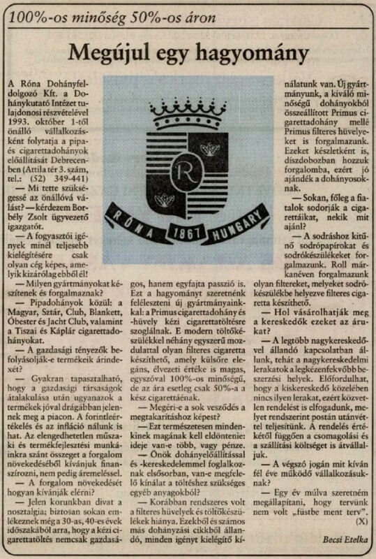1993. október 1-jén a luxemburgi illetőségű Heintz van Landewyck és a Dohánykutató Intézet mindössze 21 fős induló létszámmal létrehozott egy vegyesvállalatot Róna Dohányfeldolgozó Kft. néven, melynek elsődleges célja volt, hogy hazai munkaerővel, költséghatékonyan gyárthasson olyan újfajta termékeket, melyek nem csak belföldön, de Európa többi országában is sikeresek lehetnek. A kezdeti évben a már forgalomban lévő néhány márka, főként a Magyar és Óbester pipadohány és a Tiszai cigarettadohány jelentette a termékkínálatot.