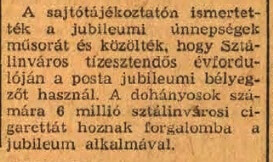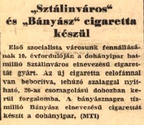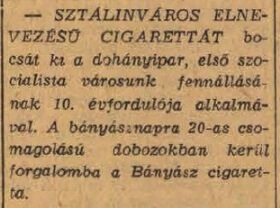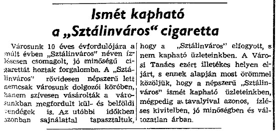 6 millió szál /300.000 csomag/ készült a város fennállásának 10. évfordulójára. Sikere miatt a későbbiekben is gyártották, de 1961 végétől a város nevével együtt a cigarettáé is Dunaújvárosra változott.